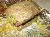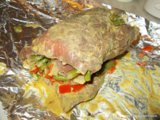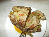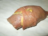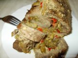 РУЛЕТ ИЗ ГОВЯДИНЫ:) Берем говядину. Я купила два пласта мяса толщиной см 3. и разрезала их вдоль ножом, не до конца, а так. чтобы лента получилась. Теперь мясо слегка отбиваем молоточком. :) Посыпаем специями для говядины по вкусу. Слегка присаливаем. и намазываем готовой горчицей. Затем сворачиваем мясо в рулет, заворачиваем в фольгу и отправляем в холодильник часа на 1,5-2 для маринования. :) Тем временем делаем овощную начинку. :) Обжариваем слегка. в небольшом количестве растительного масла небольшую луковицу. порезанную четверть кольцами и 1 болгарский перец. Перец режем кубиками. :) Еще понадобится пачка замороженной стручковой фасоли. :) Добавляем фасоль в лук с перцем. присаливаем по вкусу и слегка тушим, минут 10. :) Даем тушеным овощам остыть. :) Через 1.5-2 часа достаем из холодильника мясо. Разворачиваем рулет. Выкладываем на него слоем тушеные овощи и снова сворачиваем в рулет. :) заворачиваем рулет в эту же фольгу. А сверху еще слой фольги, чтобы сок не вытекал. :) Выкладываем рулеты на противень и запекаем в духовке 1,5 часа при температуре 200 градусов. :) Минут за 5-7 до окончания приготовления рулета фольгу сверху разрезаем и даем "спинке" рулета зарумяниться слегка:) Выкладываем рулет на блюдо, нарезаем ломтями. :) Вкусно!
