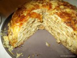 Добрый день, всем уважаемым форумчанам В прошлую субботу проволынила с рецептами...:|: Буду исправляться. :) Нынче у нас масленица. :) Все пекут блинчики. :) И я тоже:) Начнем с БЛИННОГО ПИРОГА :) Для блинного пирога я пеку блинчики на молоке. :) Они более плотные по консистенции. чем блины на кефире, или простокваше. :) Не буду показывать сам процесс выпечки блинов. Блины можно выпечь любые. по своему вкусу и любимому рецепту. :) Итак, испекли блины. :) Теперь делаем начинку для блинного пирога. :) Берем свежезамороженные шампиньоны, отвариваем их в подсоленной воде :) Откидываем на дуршлаг. даем остыть. а потом перемалываем в комбайне в пюре Еще нужно будет 1 крупную луковицу репчатого лука мелко порезать (я измельчила лук в комбайне) и обжарить на растительном масле до золотистого цвета. :) Теперь смешиваем в посудине грибное пюре+ обжаренный мелкопорезанный репчатый лук+ тертый на мелкой терке сыр + 2-3 столовые ложки сметаны. :) Солим. перчим по вкусу. :) Смешиваем. Получаем вот такую однородную массу. :) Теперь в разъемную форму (можно на противень) выкладываем блин смазываем его тонко грибной начинкой Кладем следующий блин. снова смазываем и так далее :) Потребуется примерно 15-20 штук блинов. :) Получается вот такая стопочка ;););) Сверху посыпаем наш блинный пирог тертым сыром и раскладываем несколько кусочков сливочного масла. :) Отправляем в духовку на 20 минут при 180-200 градусах:) Получилось вот так красиво и вкусно Режем на кусочки как торт и кушаем. :) Мне больше нравится остывший вариант пирога. :)