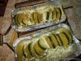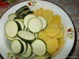На гарнир к мясу у нас ЗАПЕЧЕНАЯ В СЛИВКАХ КАРТОШКА С КАБАЧКОМ:) Чистим картошку. нарезаем ее кружочками. :) Также кружочками нарезаем кабачок, или цуккини. Кабачки сейчас пошли, молоденькие. нежненькие. :) Готовим заливку. :) 2 столовые ложки растительного масла смешиваем с щепоткой розмарина сушеного, добавляем мелкопорезанный чеснок (2-3 зубчика) ,солим ,перчим по вкусу:) Выкладываем картошку и кабачок в одноразовые формочки из фольги. Чередуя. :) 1-2 кружочка картошки, 1кружочек кабачка и т. д. :) Сверху выливаем нашу заливку А потом еще заливаем овощи сливками. :) У меня сливки 20%. :) 1 маленькой пачки хватает на 2 формочки с овощами. :) Накрываем формочки сверху кусочками фольги плотно. и ставим на решетку, на мангал тушится. :) Минут через 20 готово! Все зависит от жара углей. :) Готовность можно проверять ножиком. тыкая прямо через фольгу. ;) Через 20 минут получилась такая вкуснятина. Но кушать еще рановато;) Сверху горячую картошку с кабачком нужно присыпать тертым сыром. Лучше мягких сортов. :) У меня сыр сливочный. :) И дать постоять пару минут. чтобы сыр расплавился слегка. :) Очень нежно и вкусно!